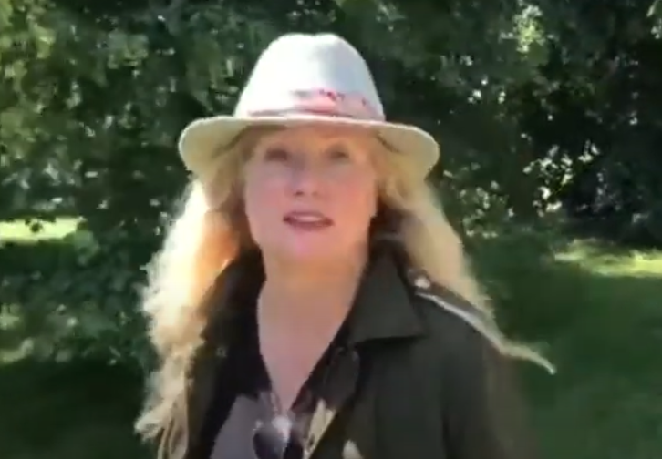 Lia Farley is walking through a tree-lined park, wearing a Panama hat and olive green jacket, blond hair flowing as sunglasses dangle from her T-shirt collar.